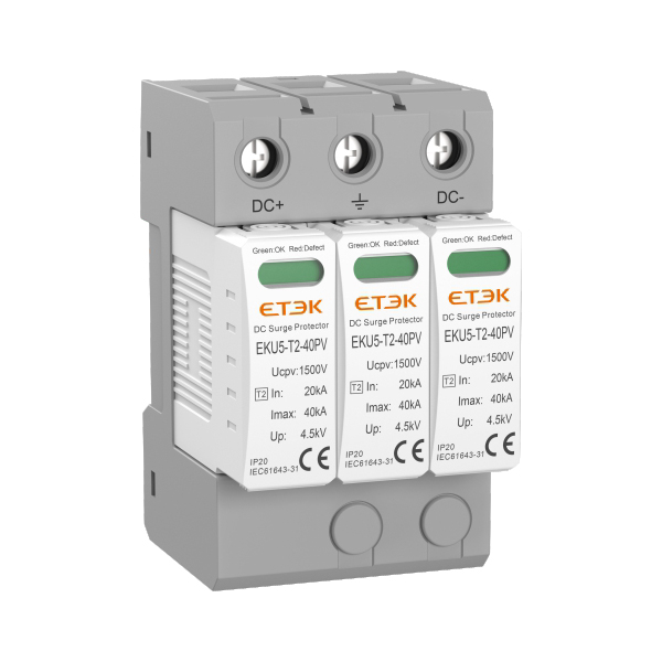 EKU5-T2直流電涌保護器適用于額定電壓DC600?1500V太陽能光伏發(fā)電系統(tǒng)或其他直流電源系統(tǒng)的防雷及過電壓保護。滿足II類(8/20μs波形)電涌保護器(SPD)試驗,用于抑制瞬態(tài)過電壓低于設(shè)備耐沖擊過電壓,泄放電涌能量,從而保護系統(tǒng)電路及設(shè)備,針對光伏系統(tǒng)設(shè)備保護設(shè)計U、Y型結(jié)構(gòu)。